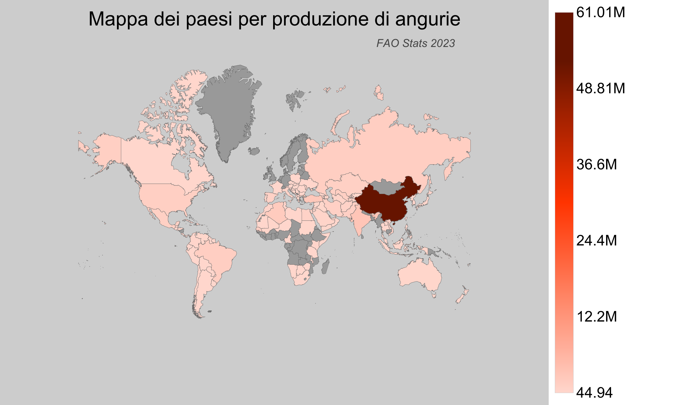 Nel 2023, la produzione globale di angurie ha raggiunto circa 105 milioni di tonnellate. Dall'inizio del periodo di monitoraggio nel 1961, quando la produzione era di circa 18 milioni di tonnellate, c'è stato un aumento significativo e costante. Negli ultimi decenni, la crescita è stata guidata principalmente dai grandi produttori asiatici, con incrementi annuali regolari. Rispetto alla produzione nel 1961, la produzione è aumentata di più di cinque volte, indicando una forte domanda globale di questo frutto.