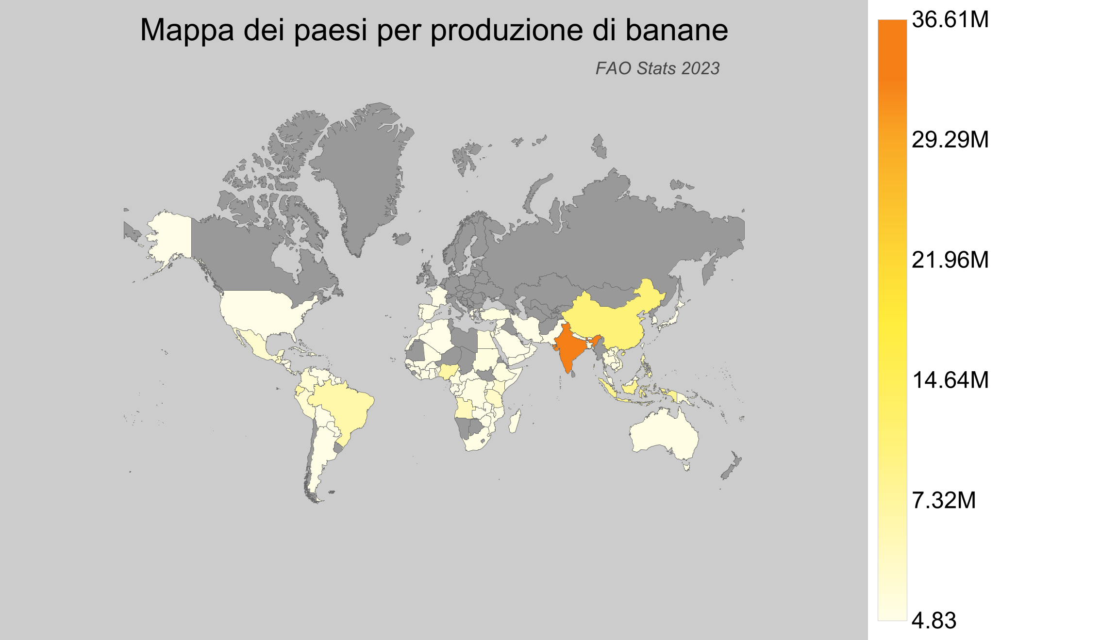 - È interessante notare che una considerevole parte della produzione mondiale è dominata da pochi paesi, sottolineando la concentrazione geografica della produzione di banane.