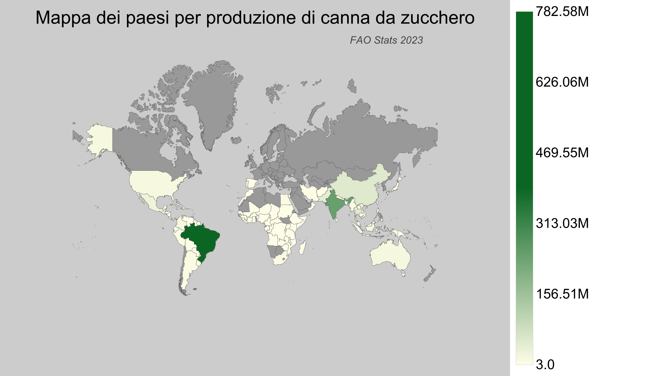- Brasile e India insieme producono oltre la metà della canna da zucchero mondiale, evidenziando l'importanza di pochi paesi nel panorama produttivo globale.