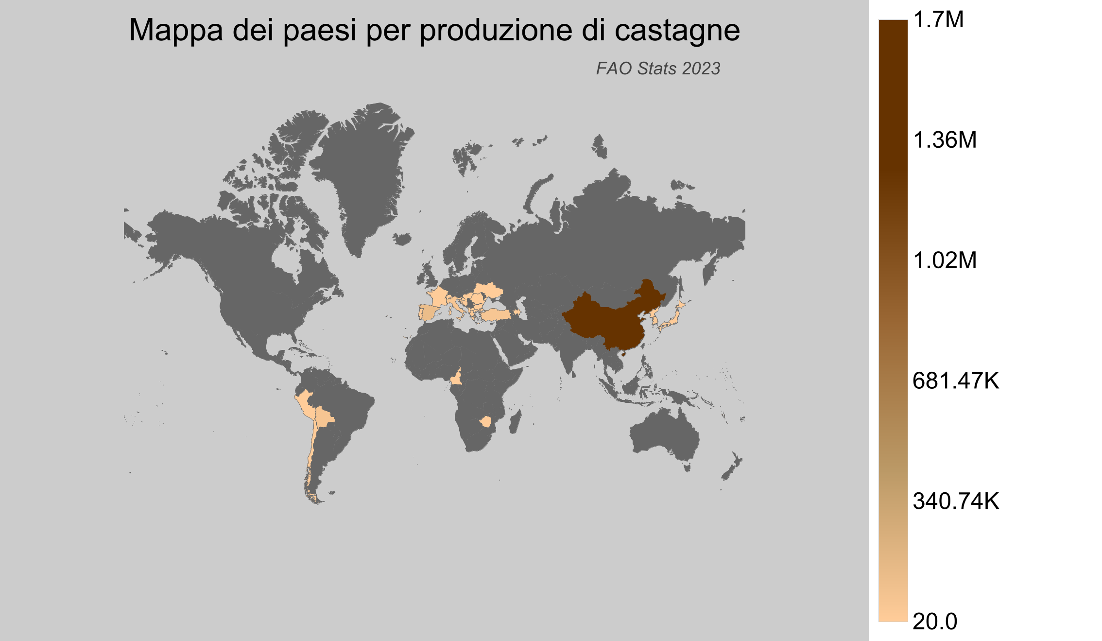 - Cina: La Cina è di gran lunga il maggior produttore di castagne, con una produzione di circa 1,7 milioni di tonnellate nel 2023.