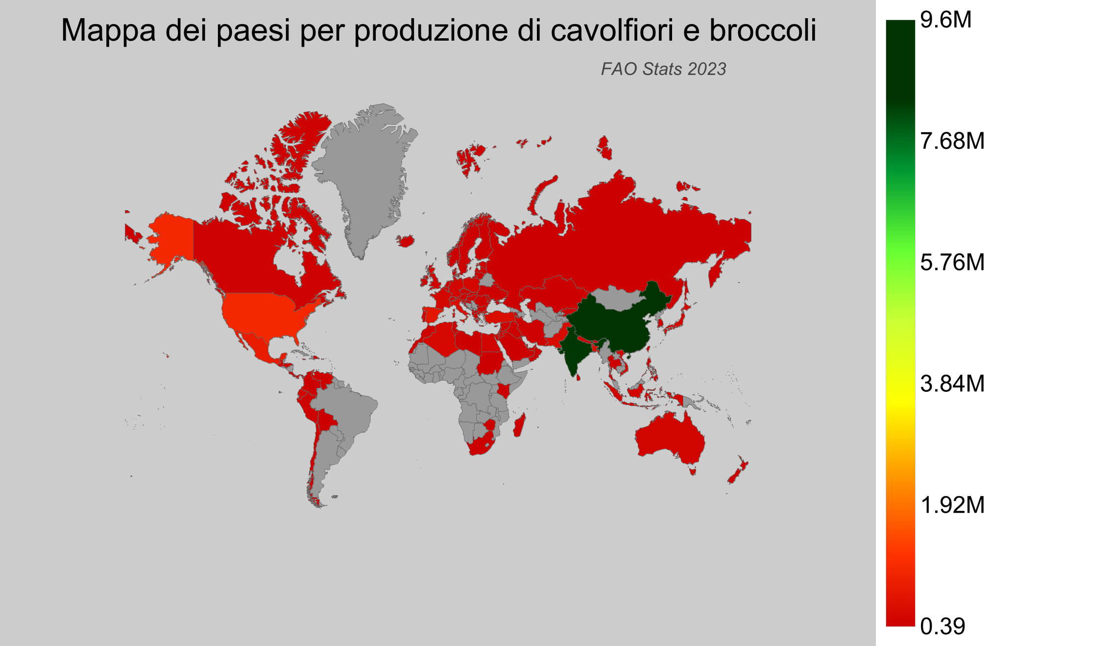 Nel 2023, la produzione mondiale di cavolfiori e broccoli ha raggiunto circa 26,5 milioni di tonnellate. Dal 1961, quando la produzione era di circa 3,5 milioni di tonnellate, c'è stato un trend di crescita costante con un aumento significativo fino al picco odierno. La crescita più rapida si è osservata a partire dagli anni 2000, con una maggiore intensità a cavallo del 2010, riflettendo una crescente domanda globale per questi ortaggi salutari.