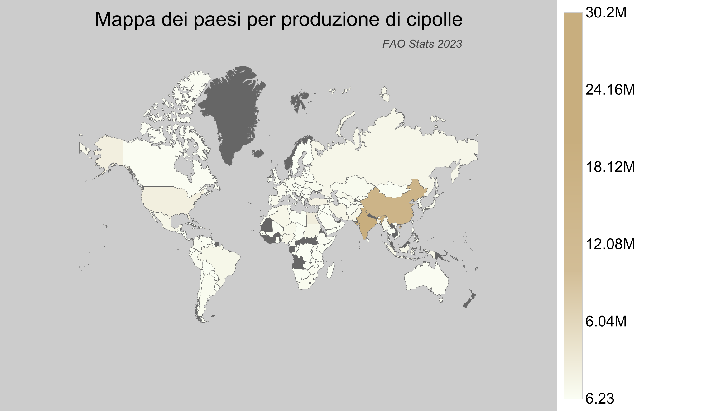 Le cipolle sono una delle colture più importanti al mondo, utilizzate in una vasta gamma di cucine grazie al loro sapore unico. Crescono meglio in climi temperati e subtropicali. Le regioni adatte alla coltivazione delle cipolle sono caratterizzate da stagioni di crescita lunghe e locali con la giusta quantità di pioggia e terreno ben drenato. I dati del 2023, i più recenti disponibili nel database della FAO al 2025, forniscono una visione approfondita sulle tendenze globali della produzione di cipolle.