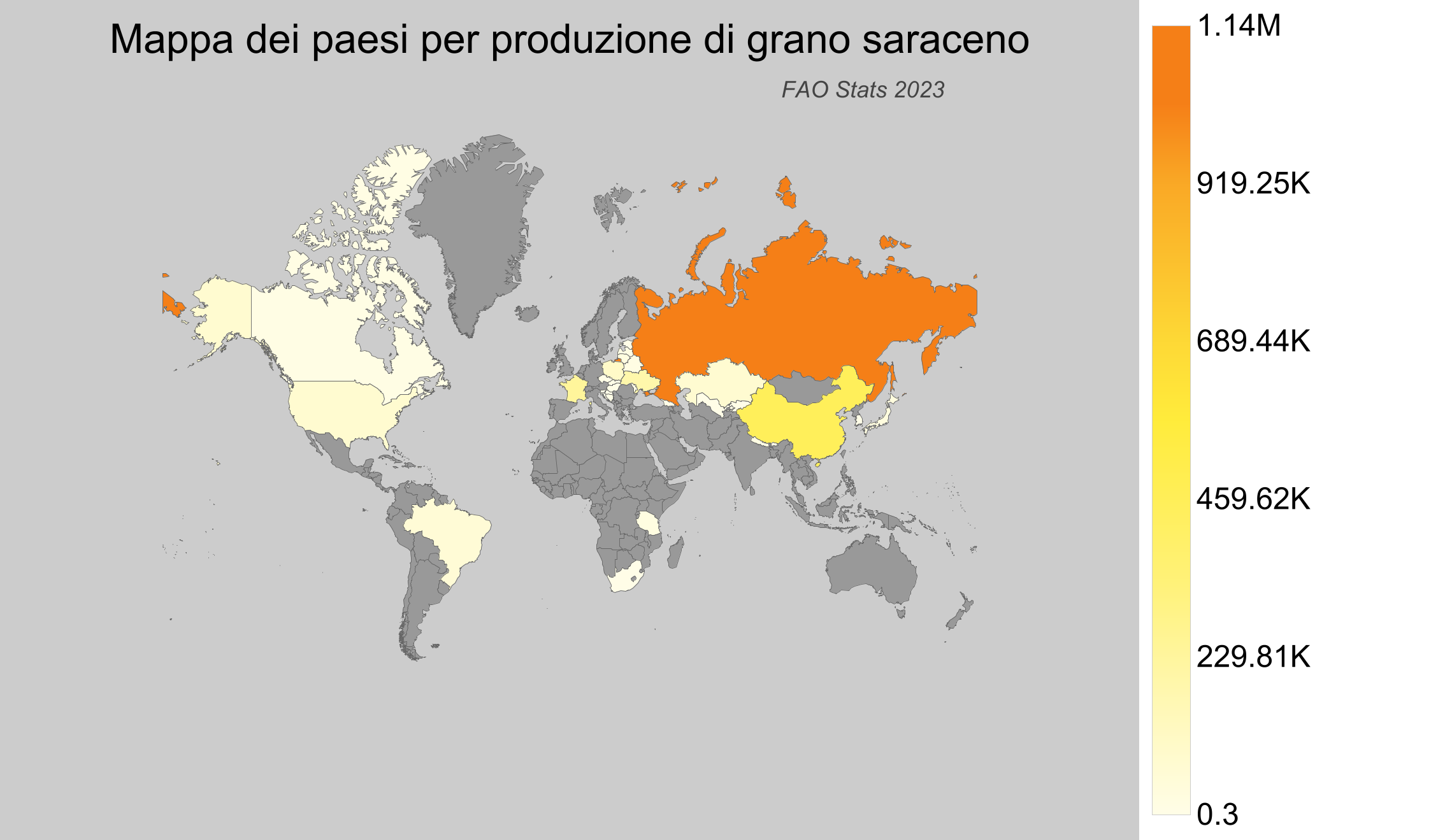 Il grano saraceno è una coltura fondamentale per l'alimentazione umana, grazie alle sue proprietà nutritive e alla sua adattabilità a climi diversi. Cresce principalmente in regioni con climi temperati e freschi. Il dato più recente disponibile secondo la banca dati FAO, aggiornata al 2025, indica che nel 2023 la produzione globale di grano saraceno ha raggiunto circa 2,2 milioni di tonnellate.