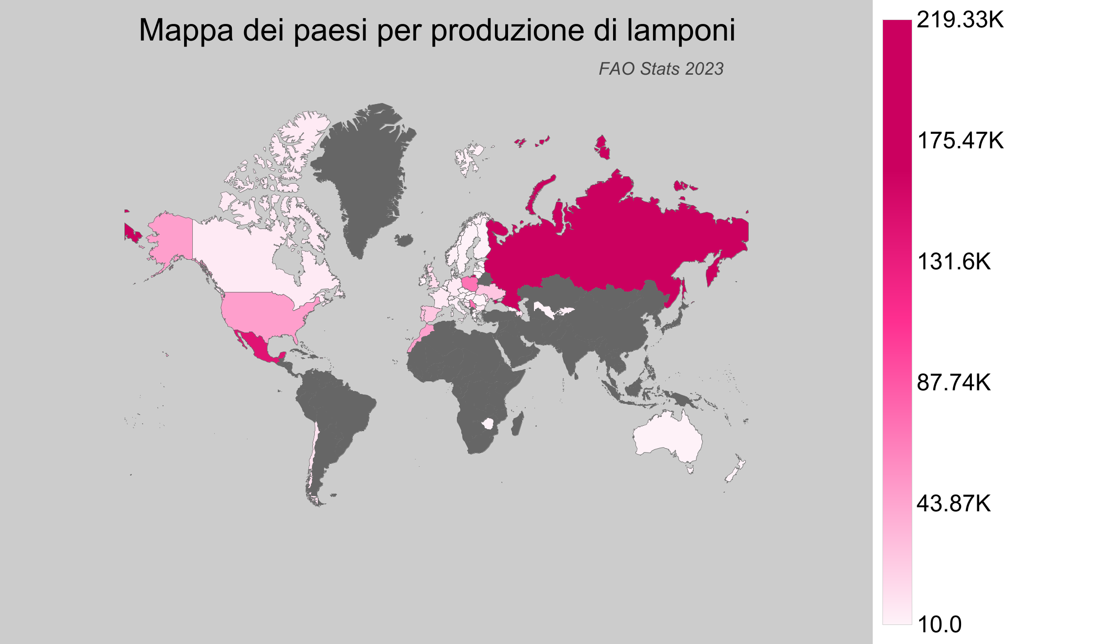 I lamponi sono frutti rossi apprezzati in tutto il mondo per il loro sapore dolce e le elevate proprietà nutritive, ricchi di vitamine, minerali e antiossidanti. Crescono meglio in climi temperati, con temperature moderate durante il periodo di crescita. Le regioni con estati miti e abbondante piovosità sono ideali per la coltivazione di lamponi. I dati qui presentati riguardano l'anno 2023, secondo le ultime statistiche disponibili nel database della Food and Agriculture Organization (FAO) nel 2025.