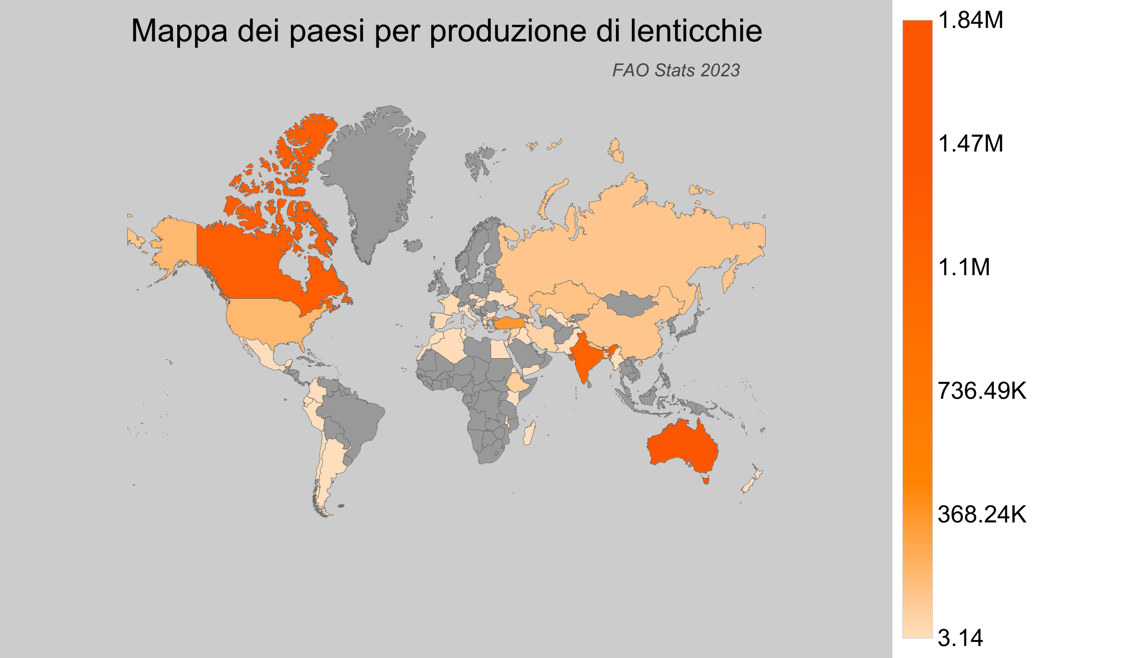 - L'Italia, pur contribuendo in misura minore, rappresenta circa lo 0,052% della produzione globale di lenticchie.