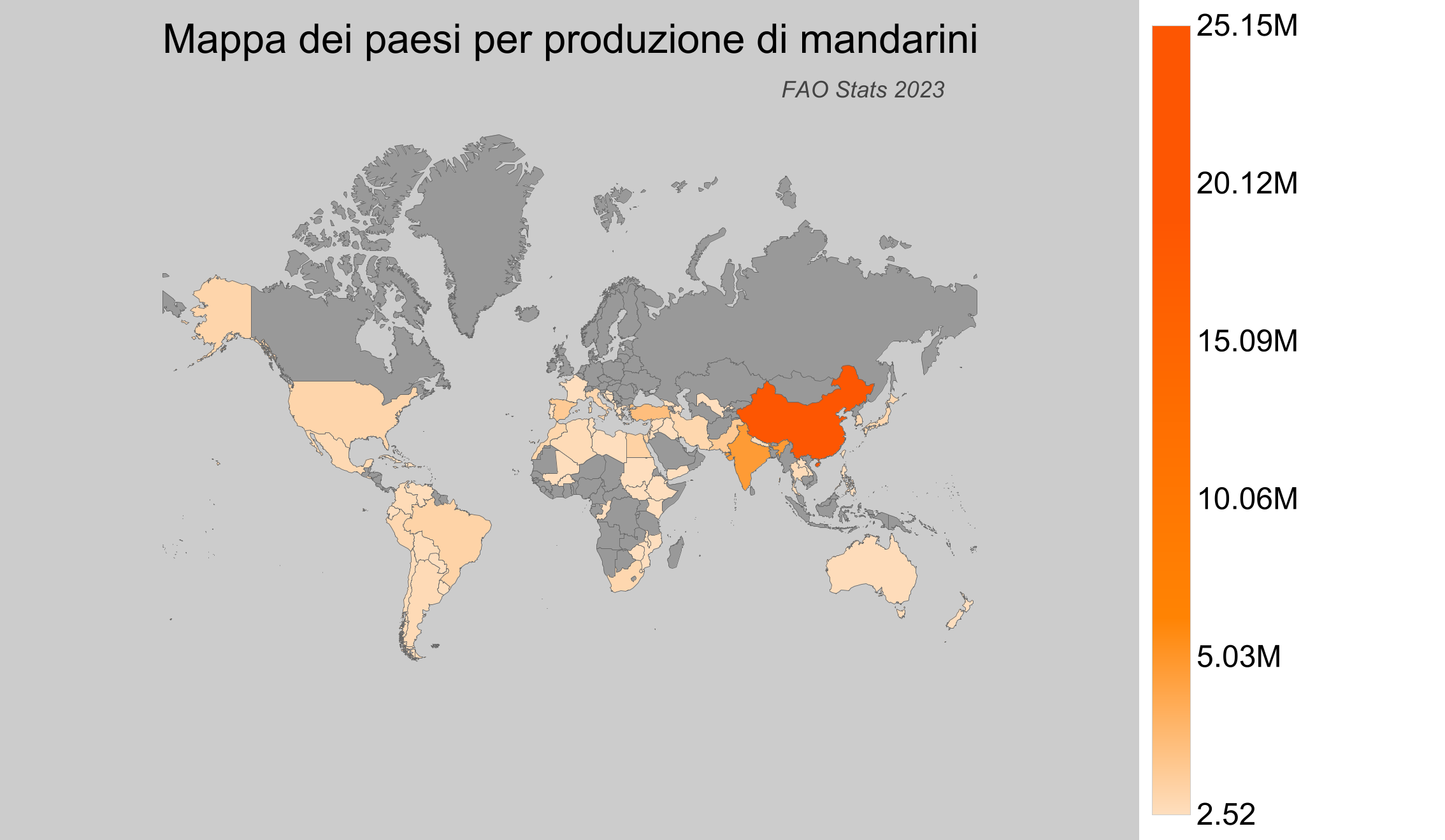 Nel 2023, la produzione globale di mandarini ha raggiunto circa 52 milioni di tonnellate. Dall'inizio dei rilevamenti nel 1961 ad oggi, c'è stata una crescita significativa. Si è passati da circa 2.84 milioni di tonnellate nel 1961 ad oltre 52 milioni di tonnellate nel 2023. Questo rappresenta un importante incremento, con notevoli cambiamenti come l'espansione della produzione in Asia.