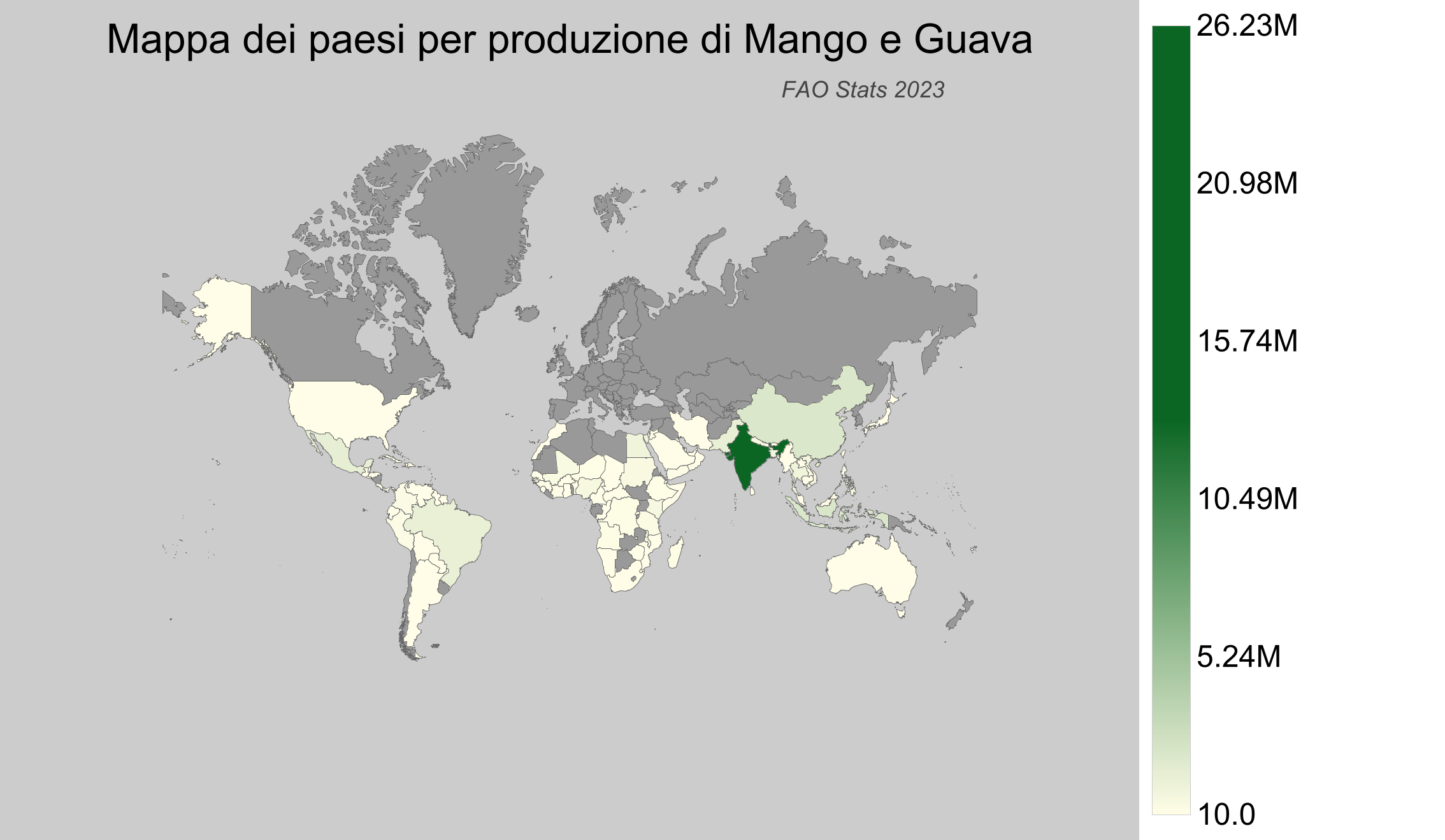 Mango e Guava sono frutti tropicali apprezzati a livello mondiale per il loro sapore delizioso e i benefici nutrizionali. Sono coltivati principalmente in regioni caratterizzate da climi tropicali e subtropicali. La produzione globale dipende da fattori climatici favorevoli e pratiche agricole avanzate. Secondo il database della Food and Agriculture Organization (FAO), i dati più recenti disponibili sono relativi all'anno 2023.