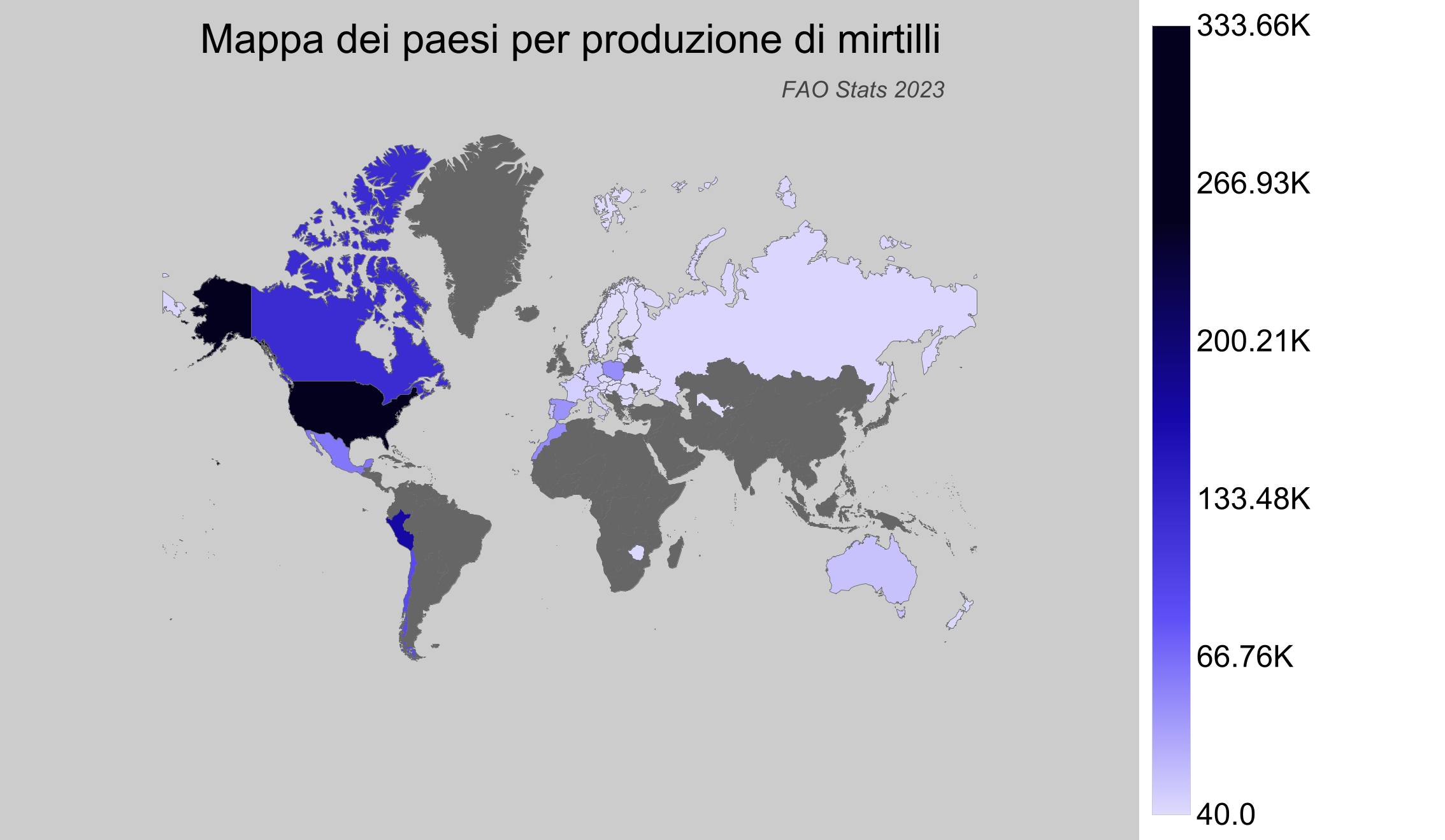 - Stati Uniti d'America: circa 333,700 tonnellate, leader mondiale nella produzione di mirtilli.