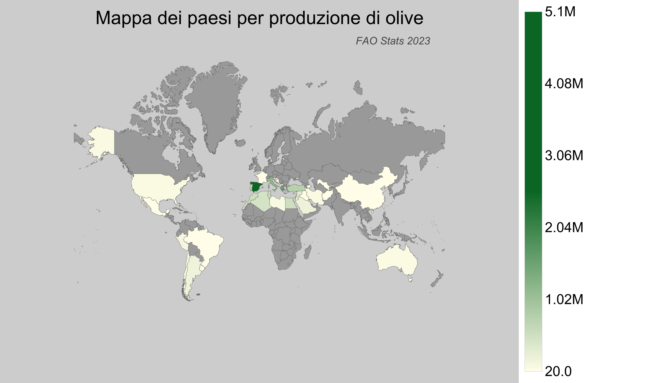 Le olive rappresentano una coltura di grande importanza economica e culturale, essendo una base fondamentale per la produzione di olio d'oliva e altri prodotti derivati. Crescono principalmente in climi mediterranei caratterizzati da estati calde e secche e inverni miti e umidi. Secondo i dati più recenti del 2023, disponibili nel database della Food and Agriculture Organization (FAO), la produzione mondiale di olive è stata una testimonianza della continua rilevanza di questa coltura agricola.