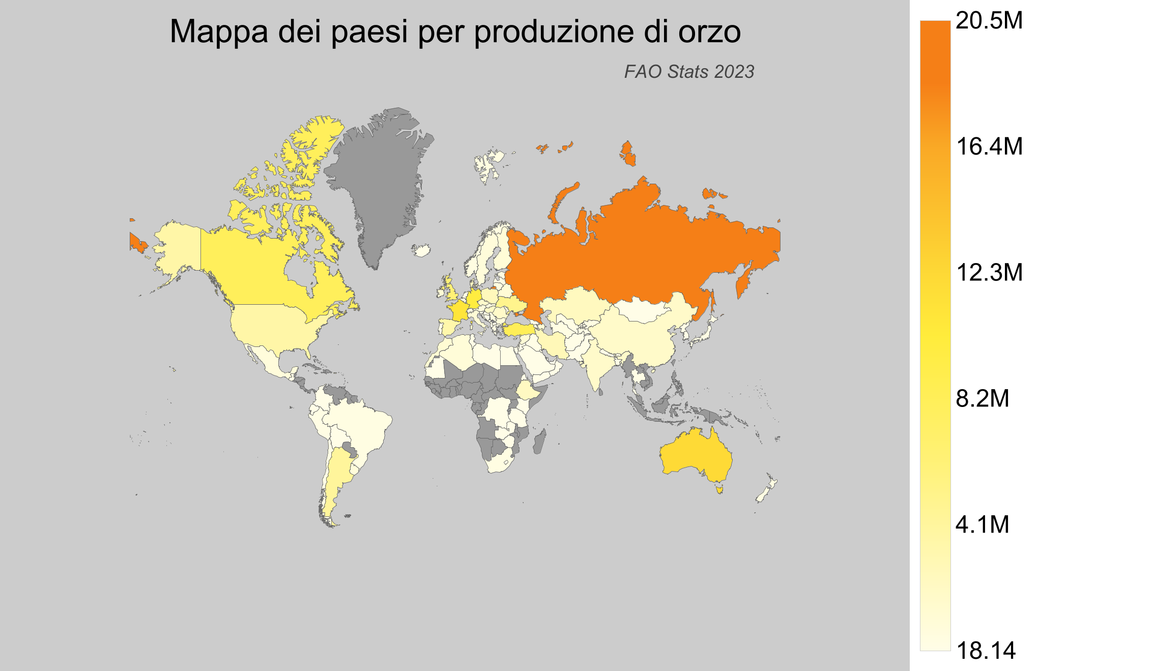 - Federazione Russa: Con una produzione di circa 20,5 milioni di tonnellate, la Russia si posiziona come il principale produttore mondiale di orzo nel 2023.