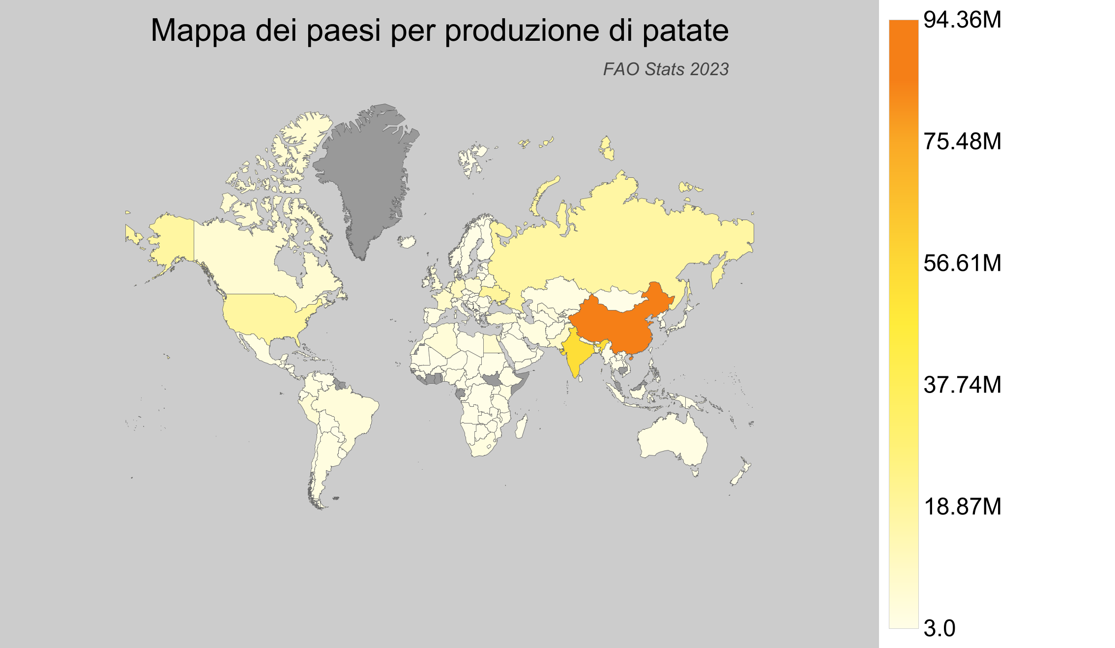 - Cina: con una produzione impressionante di circa 94 milioni di tonnellate, la Cina si afferma come leader mondiale nella produzione di patate.