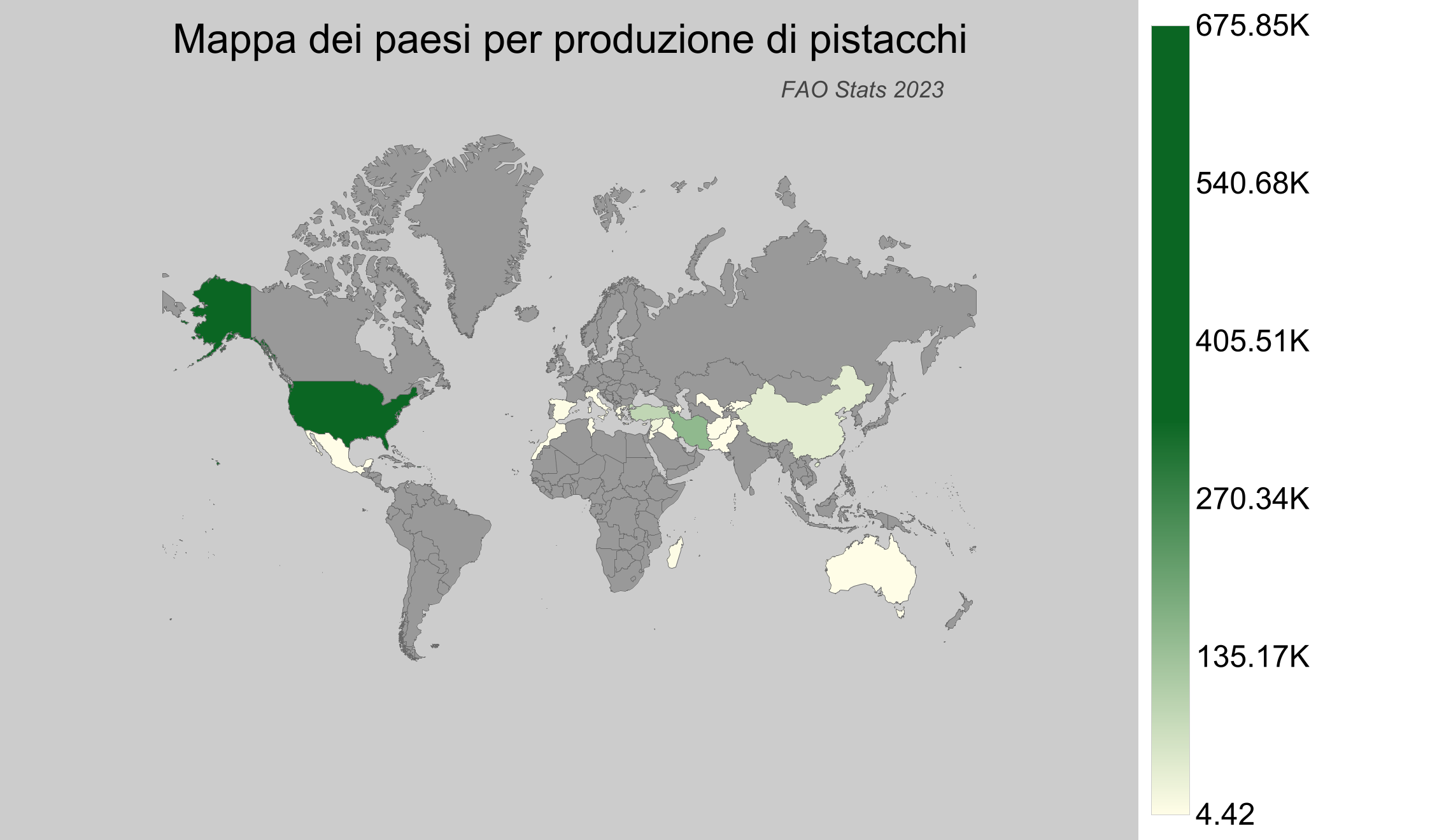 Il pistacchio è un frutto secco apprezzato per il suo sapore unico e i benefici nutrizionali. Cresce meglio in climi aridi e ricchi di sole e viene coltivato principalmente in regioni con estati calde e inverni moderati. Le stime del 2023, fornite dalla banca dati della FAO, offrono le informazioni più recenti sulle tendenze di produzione globale di questo frutto prelibato.