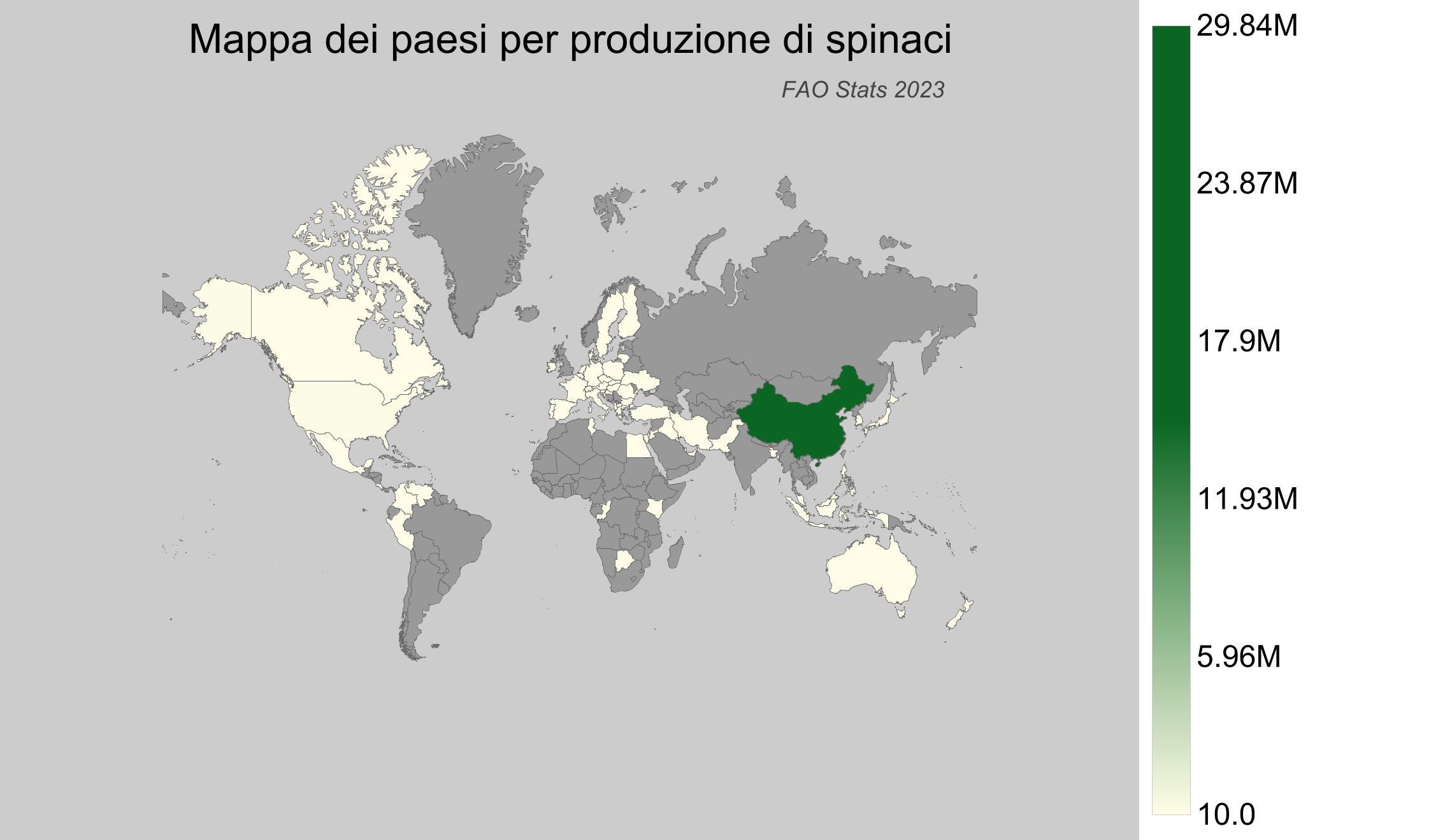 Nel 2023, la produzione globale di spinaci ha raggiunto circa 34.1 milioni di tonnellate. A partire dal 1961, quando la produzione era di circa 2.96 milioni di tonnellate, è evidente un marcato trend di crescita. Questa espansione rappresenta un aumento straordinario della domanda e della capacità produttiva, guidata principalmente da alcuni paesi leader nel settore.