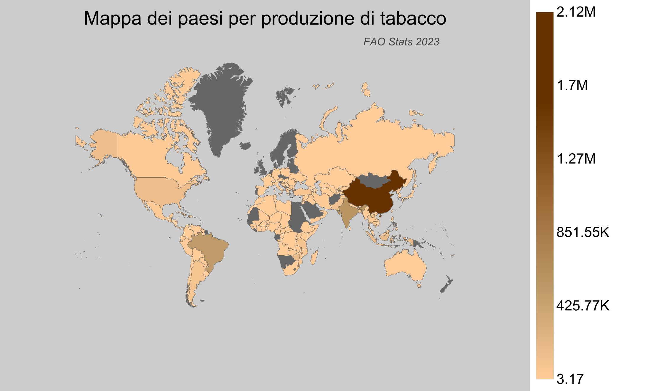 Il tabacco, una delle colture più influenti a livello mondiale, rappresenta un'importante risorsa economica per molti paesi. Cresce principalmente in climi caldi e umidi, diffusi in diverse regioni del mondo. Secondo i dati più recenti del 2023, disponibili nel database della Food and Agriculture Organization (FAO), la produzione globale di tabacco ha raggiunto un volume significativo. Con una domanda costante, il settore del tabacco continua ad avere un impatto rilevante sull'economia globale.