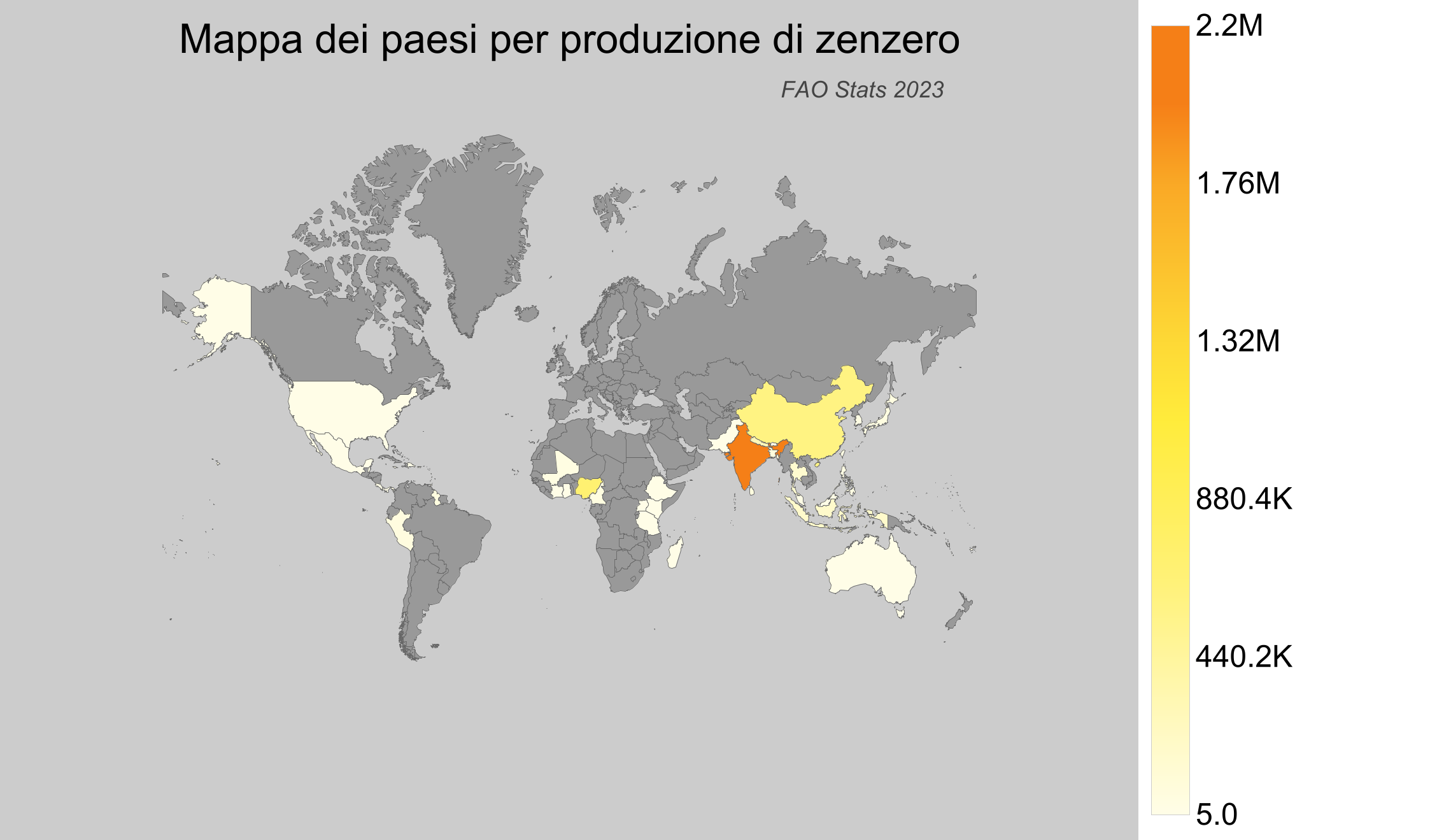 Lo zenzero è una spezia essenziale largamente utilizzata in diverse cucine mondiali e ha un valore significativo per la salute, grazie alle sue proprietà medicinali. Cresce prevalentemente in climi tropicali e subtropicali, rendendo alcune regioni particolarmente favorevoli per la sua coltivazione. I dati del 2023, che rappresentano le più recenti statistiche disponibili nel database della Food and Agriculture Organization (FAO) al 2025, forniscono un'idea chiara della produzione globale di zenzero.
