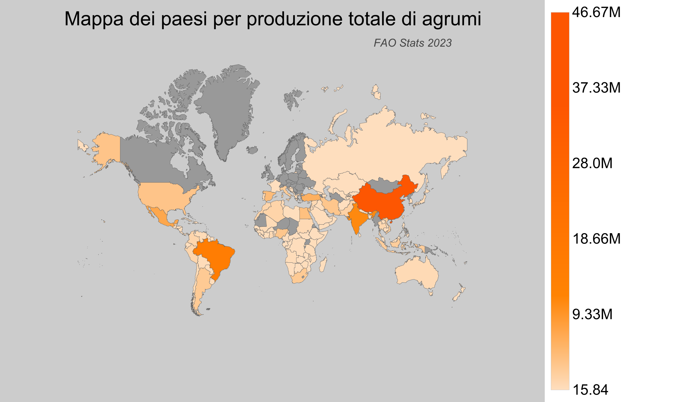 - Cina è il massimo produttore mondiale di agrumi con una produzione di circa 47 milioni di tonnellate nel 2023.